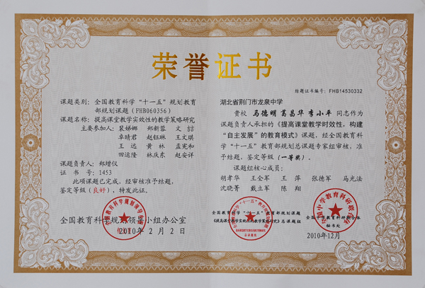 全国教育科学“十一五”规划教育部规划课题一等奖